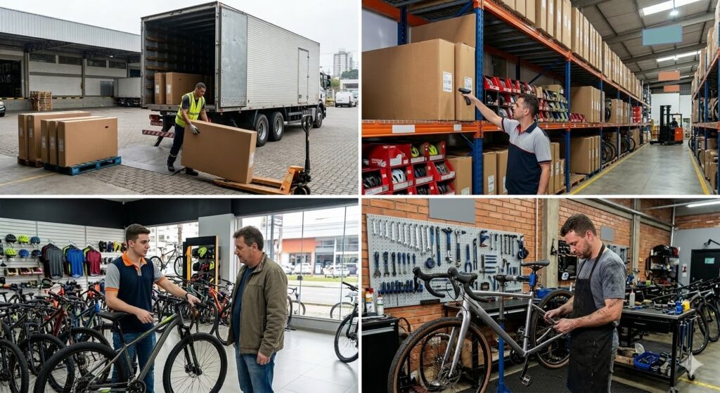 A logística no setor de bicicletas envolve diversos tipos de produtos: bicicletas completas, componentes, acessórios e peças técnicas. Cada categoria possui dinâmica própria de vendas e necessidades diferentes de reposição.
